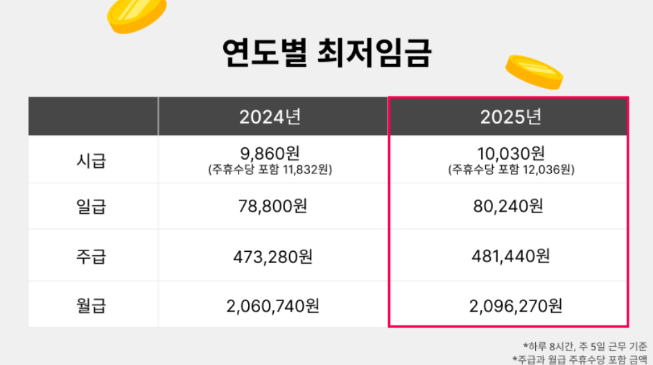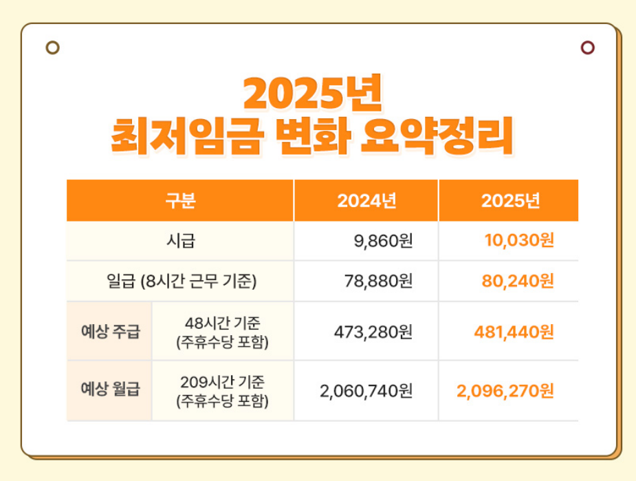 2024년 최저시급과 2025년 최저시급을 비교해 보면, 시간당 9,860원에서 10,030원으로 증가하는 것을 확인할 수 있습니다. 일급은 78,880원에서 80,240원으로, 주급은 473,280원에서 481,440원으로, 월급은 2,060,740원에서 2,096,270원으로 변화했습니다. 이러한 인상이 노동자들에게 실질적인 도움이 될 것으로 기대됩니다.
